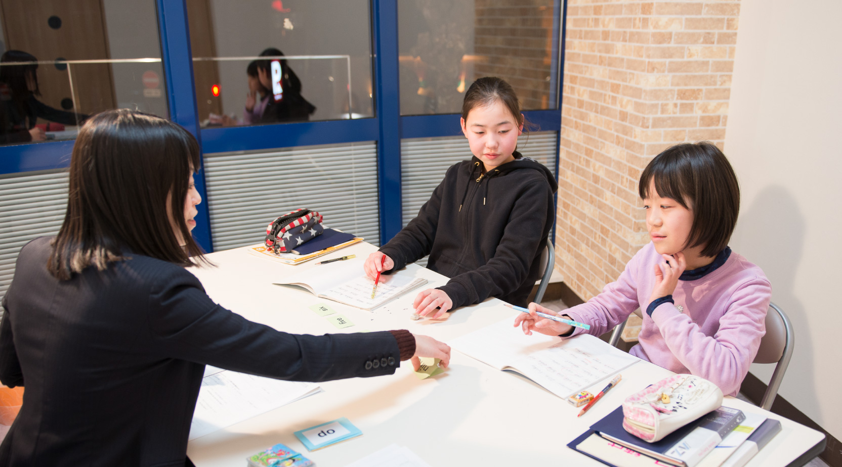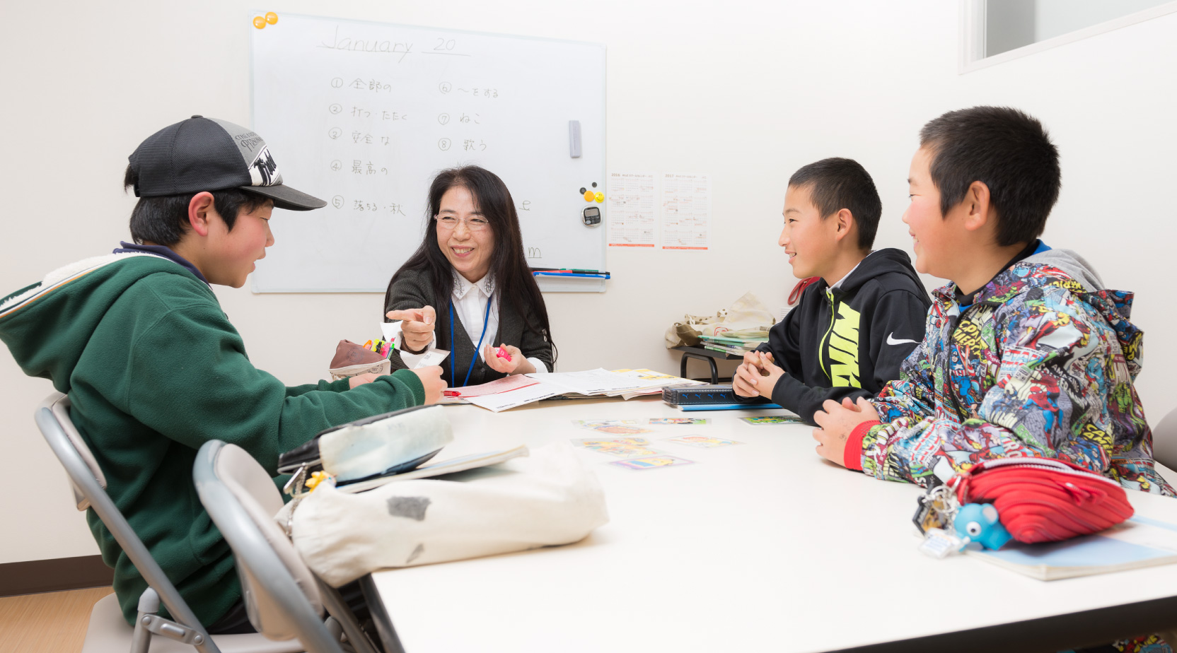 - 外国人の先生と英語でコミュニケーションをとることが楽しいです。先生はいつも笑顔で接してくれます。間違えてもヒントをもらいながら、しっかりとした発音で英語の文章を覚えることができます。違う学校の人とも友達になれてよかったです。