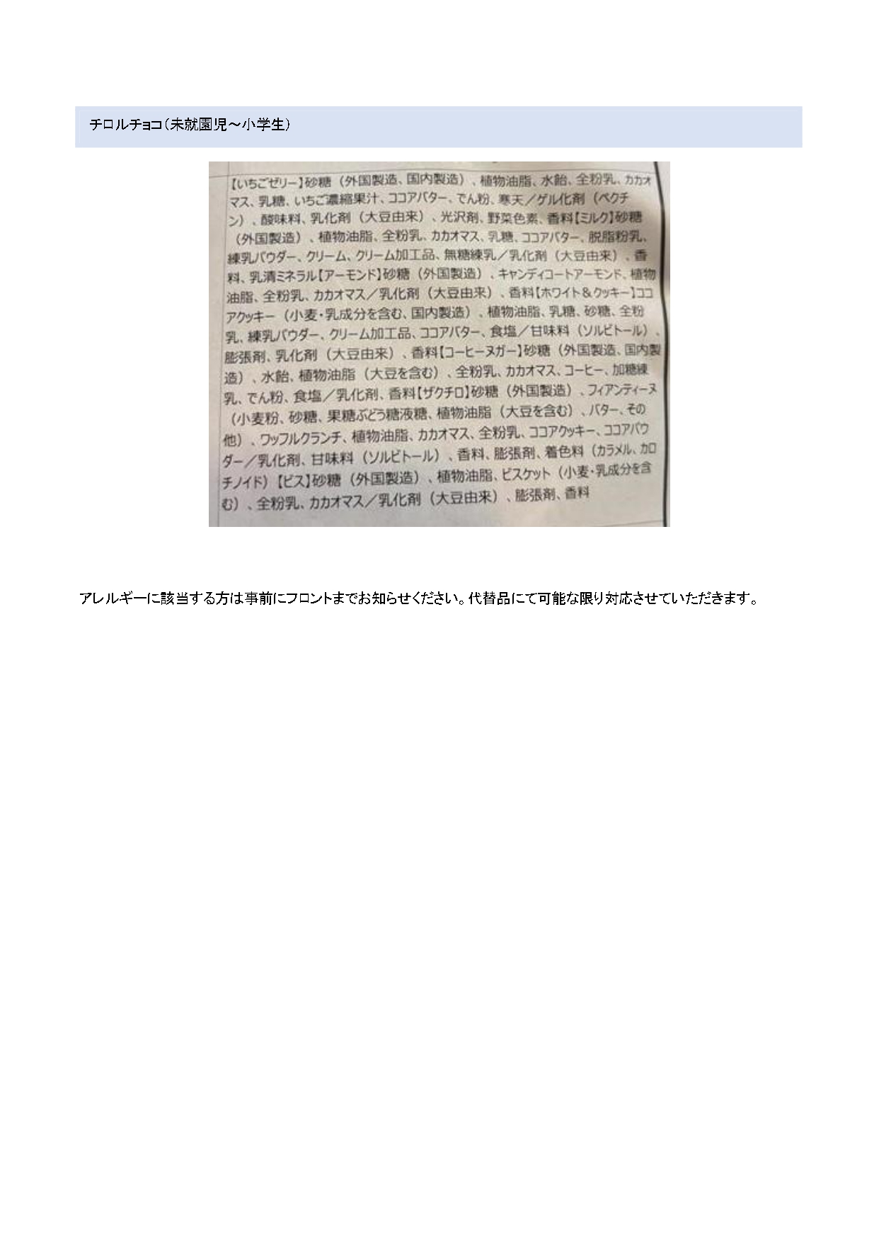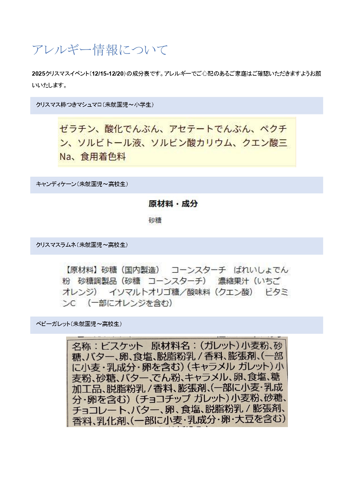 イベントではお菓子をご用意しております。以下より成分表を必ずご確認いただき、お子様の食物アレルギーでご心配がございましたら、事前にご相談ください。