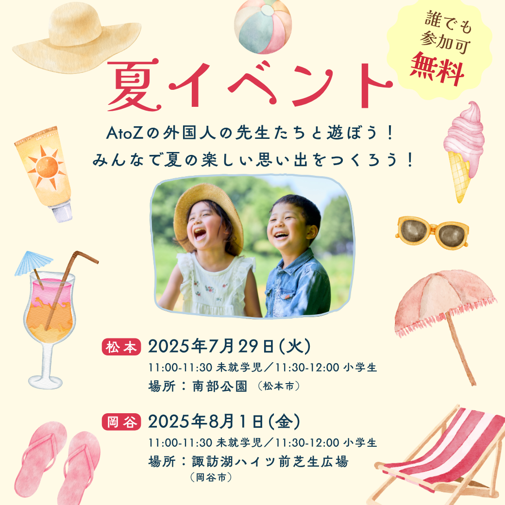 この夏、AtoZの外国人講師たちと公園で英語を使って身体を動かすアウトドアイベントを開催します✨