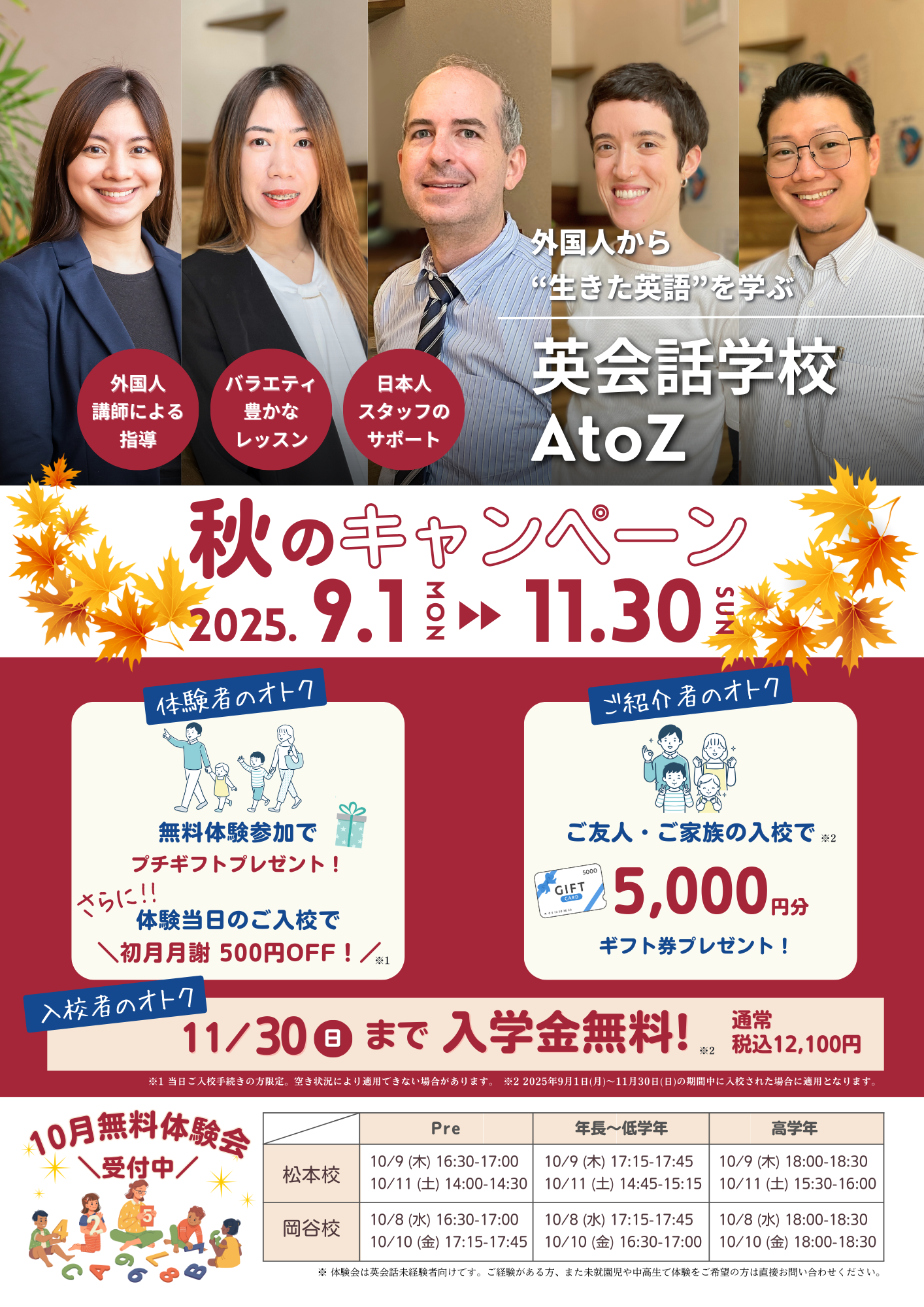 9月1日(月)〜11月30日(日)まで、秋の入校キャンペーンを実施中です!