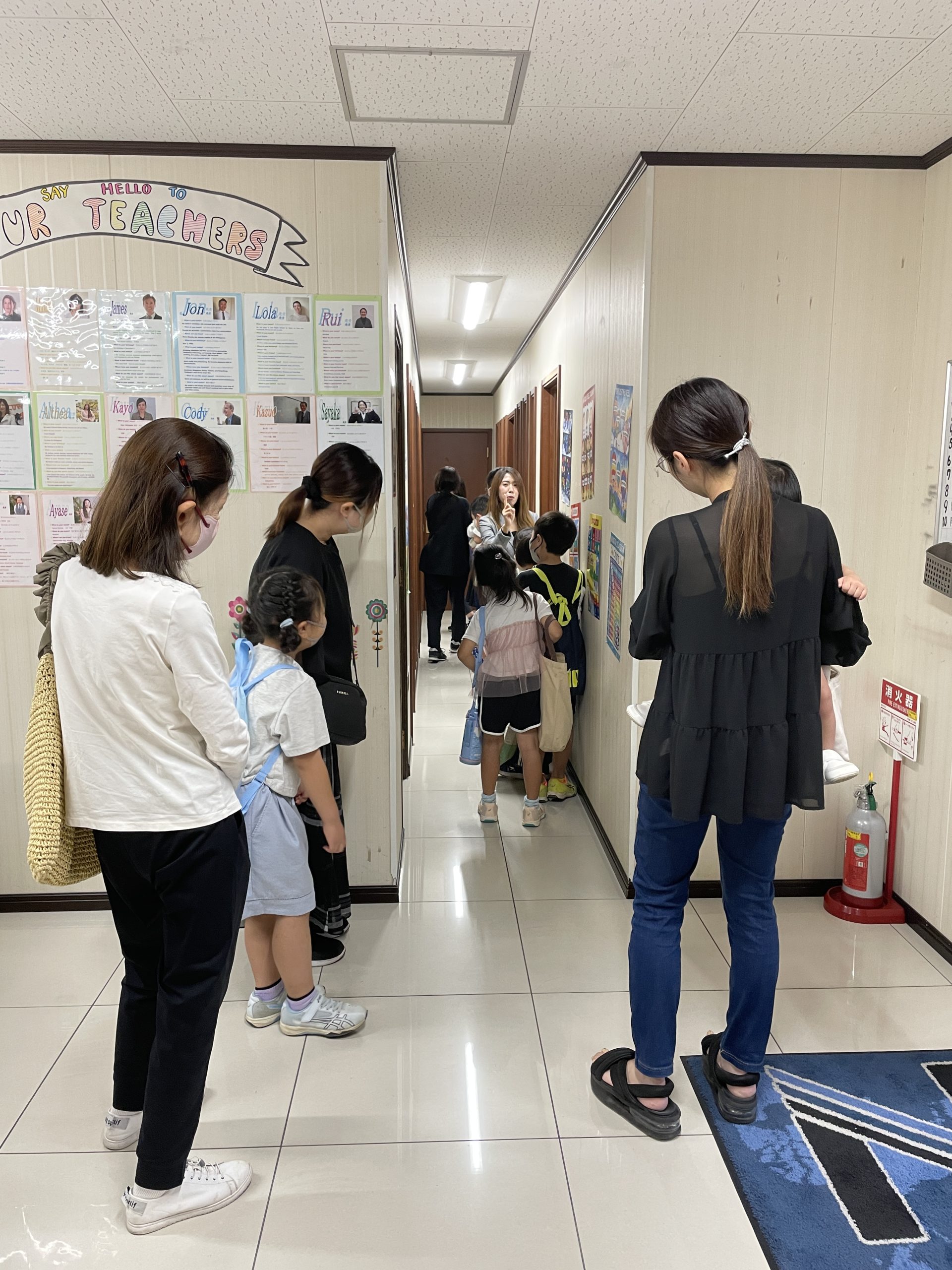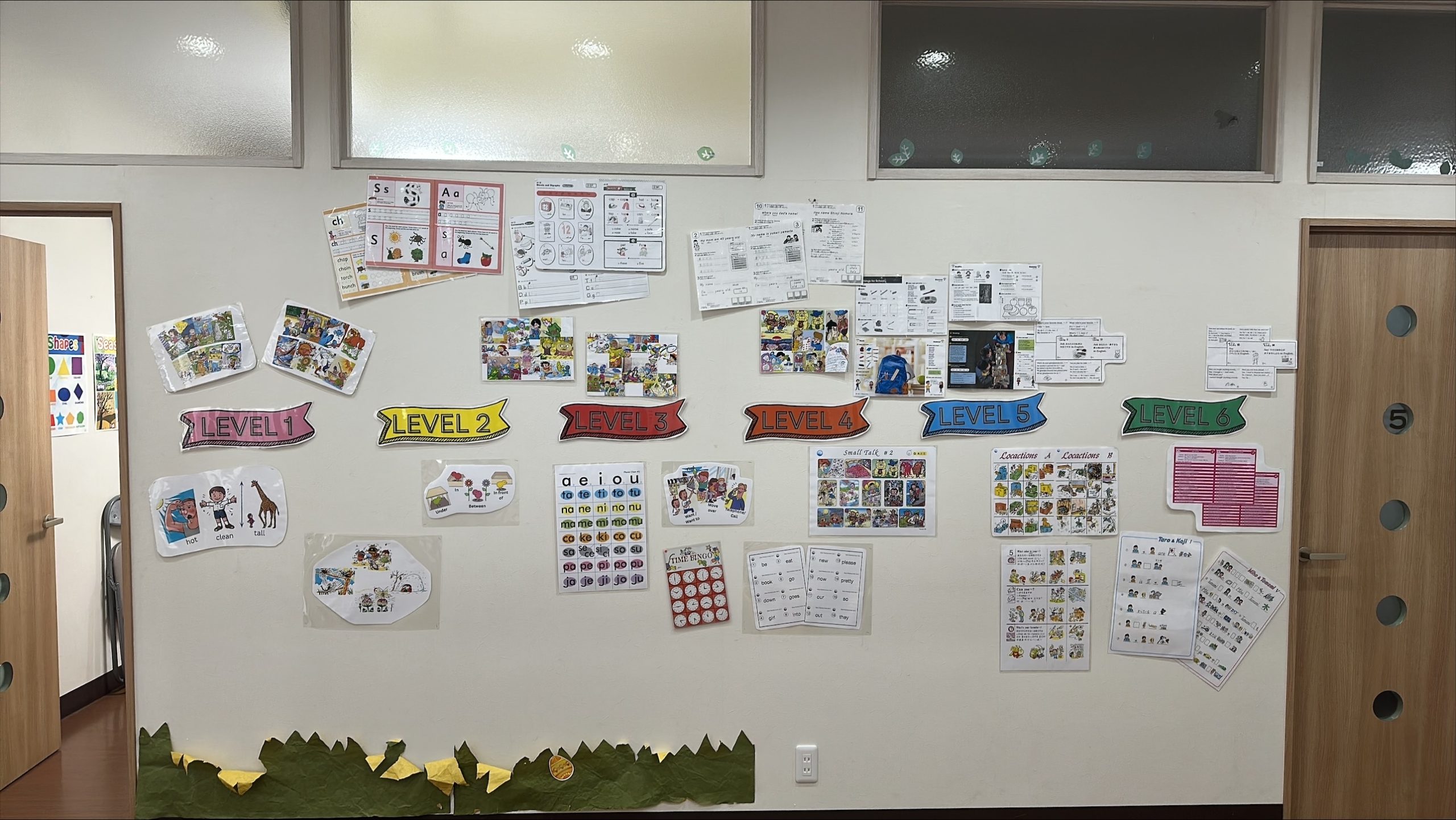 ロビーには各レベルのレッスンマテリアルやホームワークの展示、春に実施されたTGG遠足の写真、レベルアップセレモニーの写真などを掲示し、たくさんの方に見ていただけました。