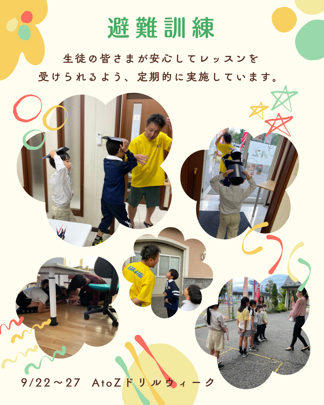 AtoZでは、生徒の皆さんが安心してレッスンを受けられるよう、定期的に避難訓練を実施しています。